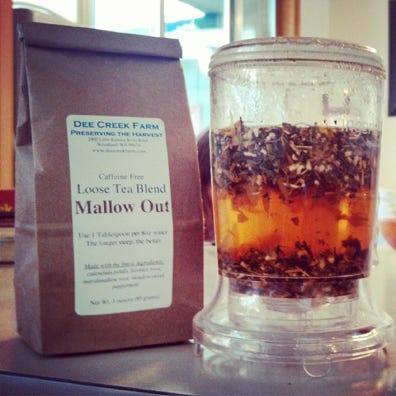 Mallow Out,  3oz - Use 1 T. per 8oz. - longer steep is best, tho' good flavor 3-5 minutes, tastes pepperminty and fresh for the season (I've used this blend to soothe tummy troubles quite efficiently). Naturally sweetened.  Caffeine-free.